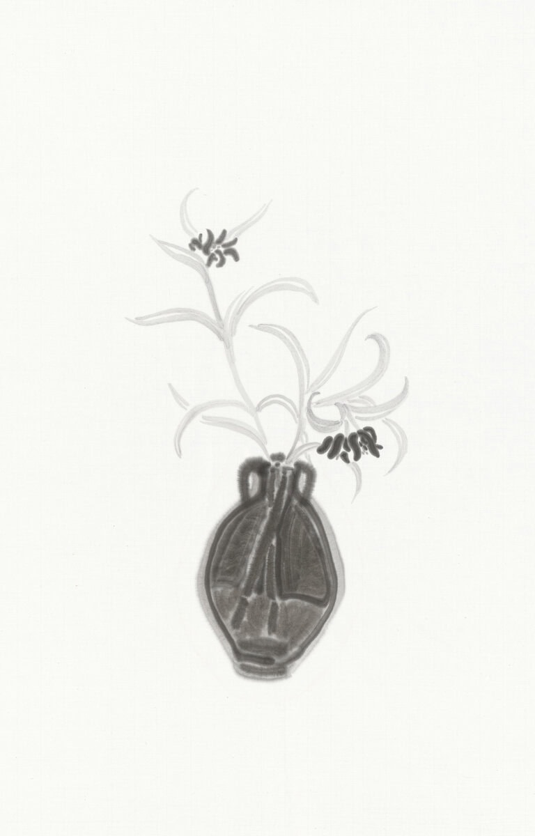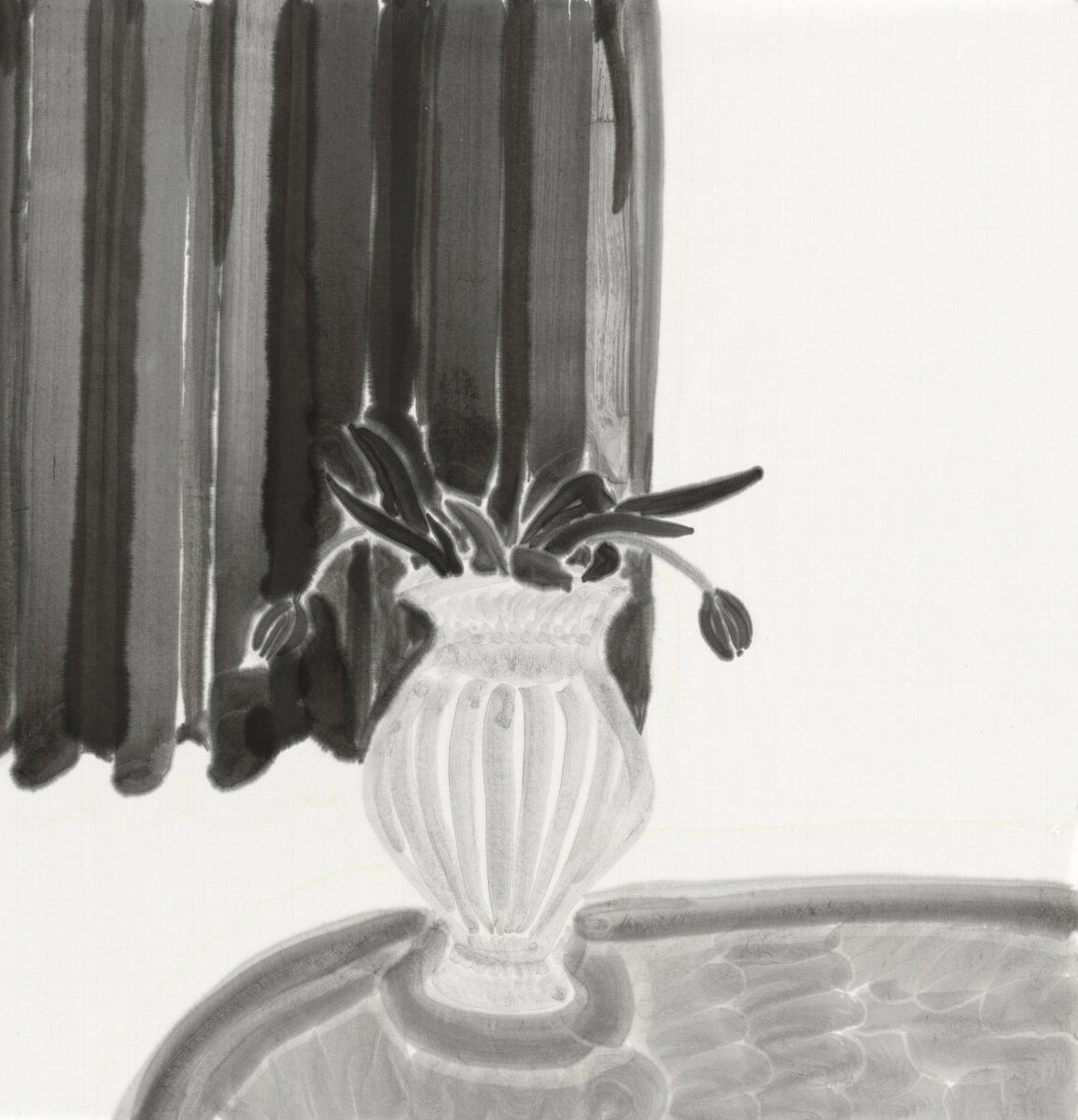 楊寓寧Yang Yu-Ning_陶瓶與鬱金Ceramic Vase and Tulips_墨水紙本Ink on paper_70 x 68cm_2025