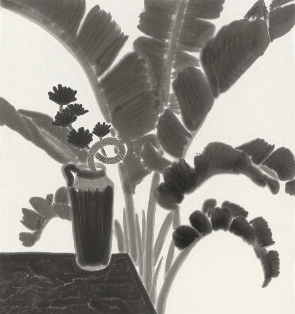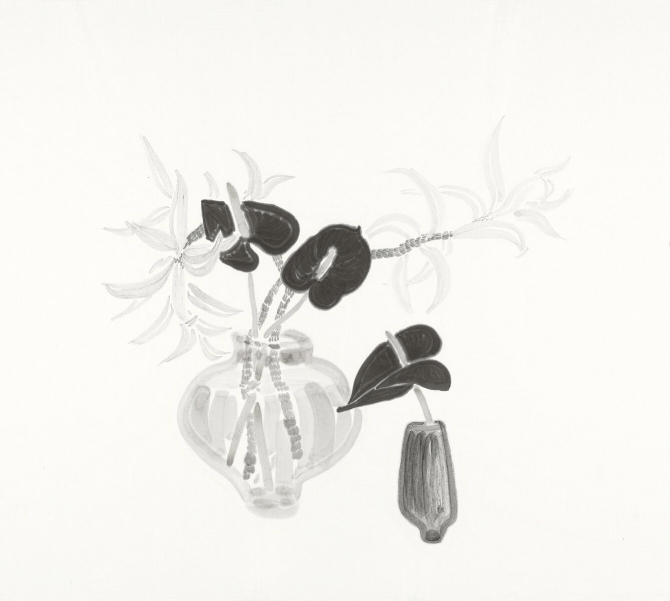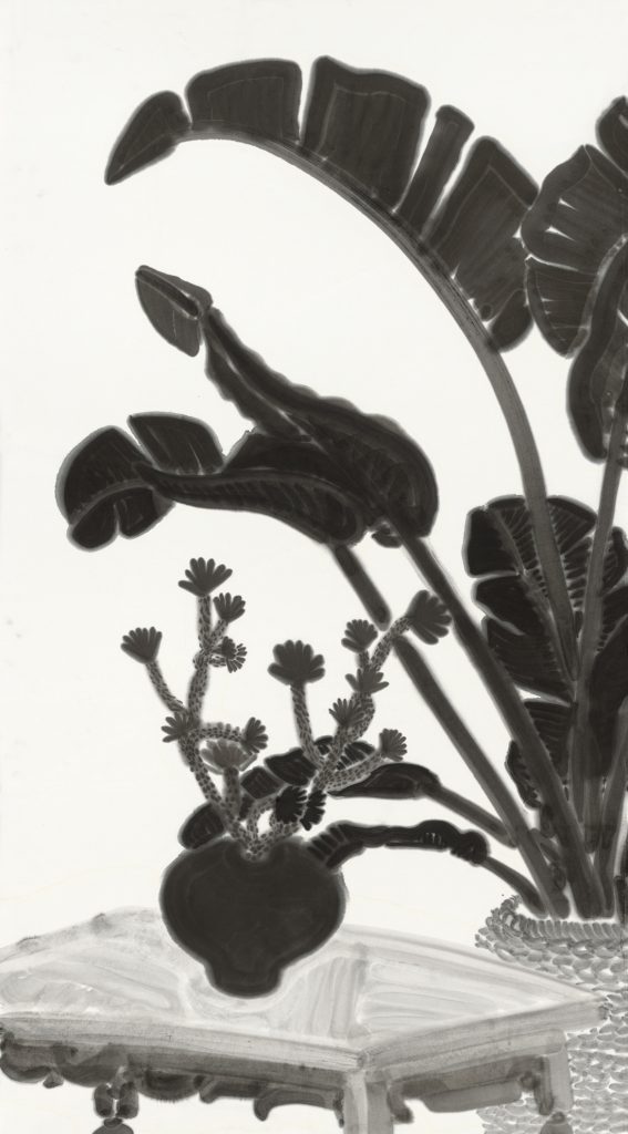 楊寓寧Yang Yu-Ning_火鶴與彎曲百合竹Anthuriums and Curved Dracaena_墨水紙本Ink on paper_77.5×85.5cm_2025