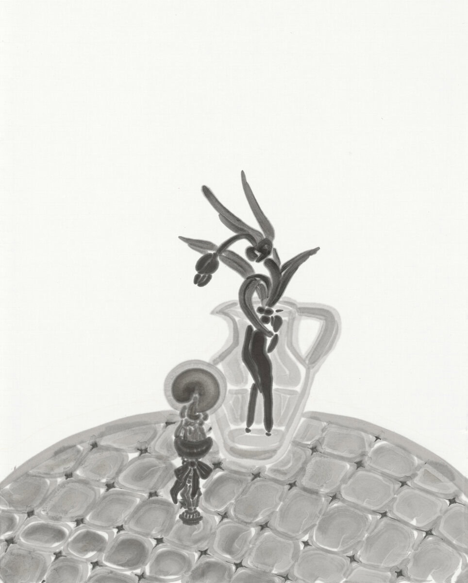 楊寓寧Yang Yu-Ning_蠟燭、鬱金香與格紋Candle, Tulips, and Plaid_墨水紙本Ink on paper_90x 79cm_2025