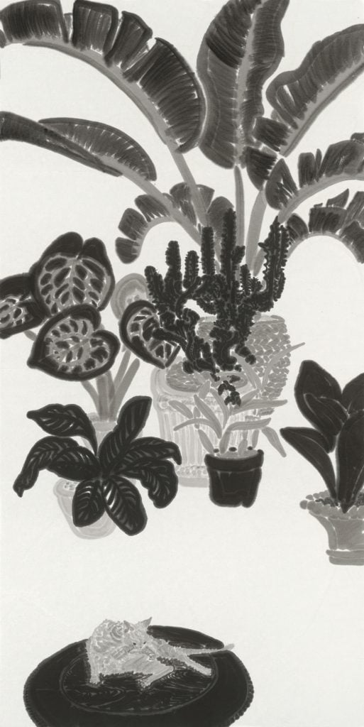 楊寓寧Yang Yu-Ning_貓與一室植物Cat and a Roomful of Plants_墨水紙本Ink on paper_248x 123.5cm_2025